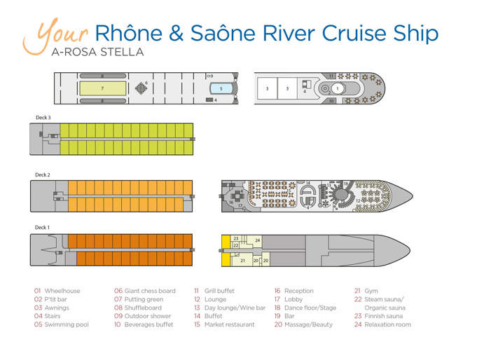 Marvel at historic sights and a landscape filled with ripening vineyards as A-ROSA STELLA cruises the waters of the Rhône and Saône. Around her wheelhouse, on her two-tier top-deck, you'll find an open-air bar, grill, drinks buffet and ample seating. Further aft, a small pool, a giant chess set, a putting green and two shuffleboard tracks offer opportunities for fun and relaxation.